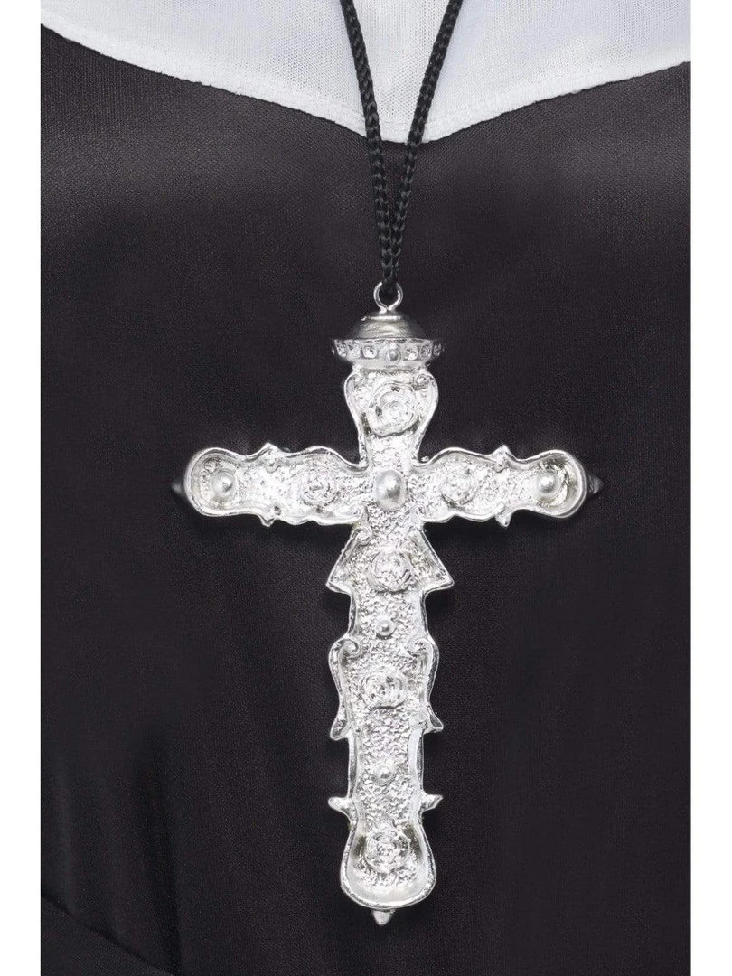 Large ornate silver cross pendant. Light weigh plastic pendant on black strand. Perfect accessory to complete your priest or nun costume or to bling up a 70s disco or gangster pimp costume.Â