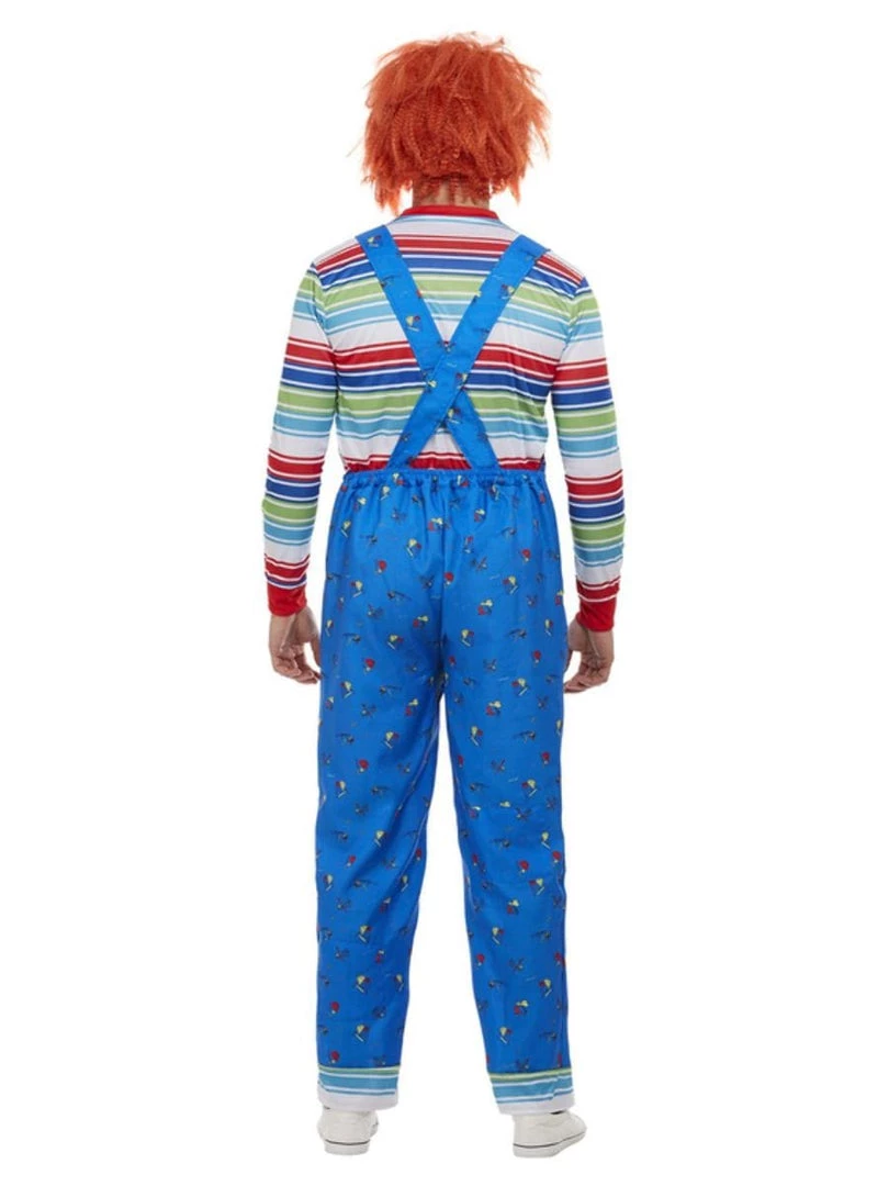 Chucky Child’s Play 2 Halloween Costume for Men includes printed denim look overalls and striped long sleeve top. Wig, make-up and Chucky Mask sold separately. Bloodied knife also sold separately. Fully licensed Chucky Costume. Also available in children’s, toddlers and baby sizes so the whole family can dress up as Chucky!