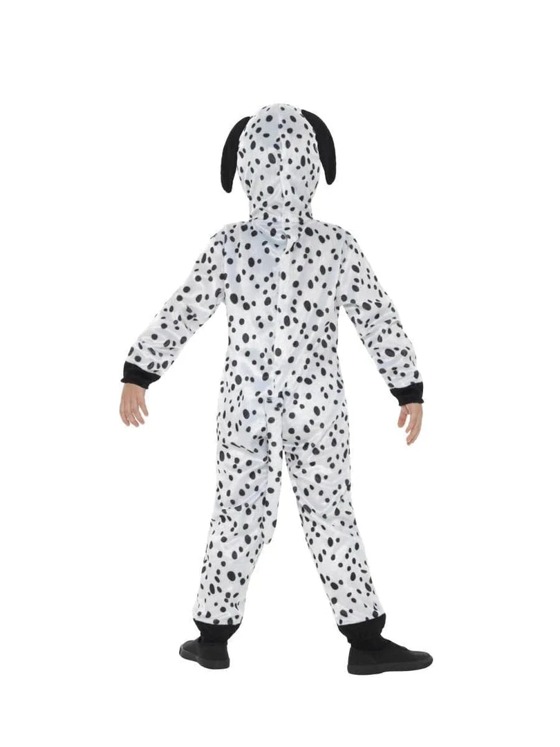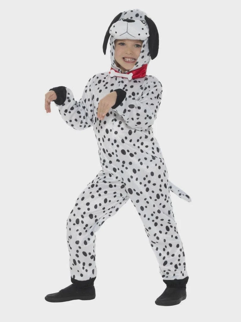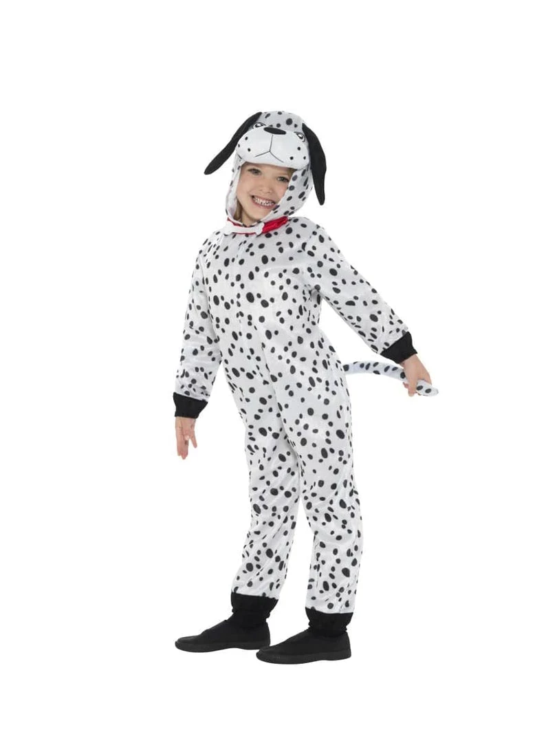 Dalmatian costume for children. Cute little black and white spotty dog jumpsuit with tail and attached hood with adorable Dalmatian head. Soft and cuddly Onesie has red collar. The perfect costume for Book Week to dress up as one of the 101 Dalmatian pups.Â