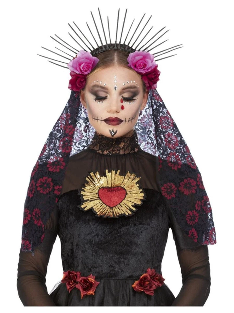 Complete your Day of the Dead Halloween Costume with this deluxe Sunburst headband. Headband with black soft spikes, attached pink and red roses and attached long black and red lace veil. Headband only. Make-up and costume sold separately.