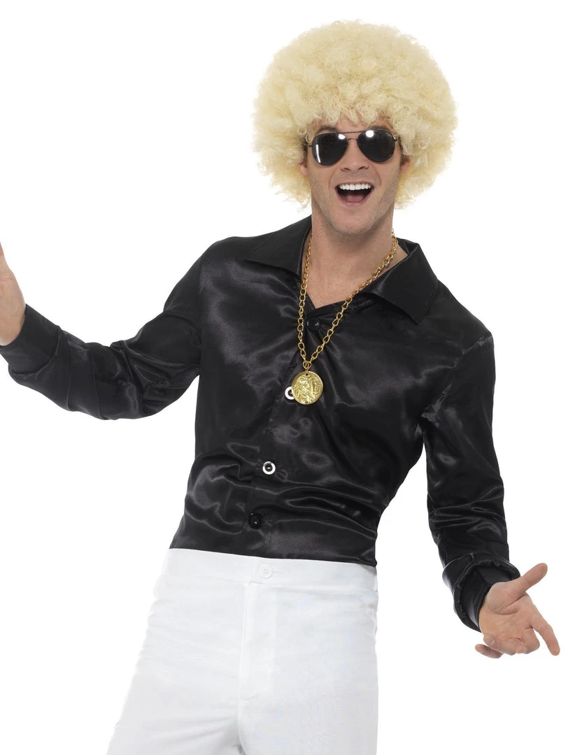 Get down and funky in this groovy 60s 70s men’s disco shirt in black satin. Add a pair of white flares and you’ll look just like John Travolta in Saturday Night Fever. Shirt has classic large pointy lapels and long sleeves. Disco shirts come in a range of colours including white, blue, green and multi patterned. Wig, glasses, pants and all other accessories sold separately. Click here for white flares.