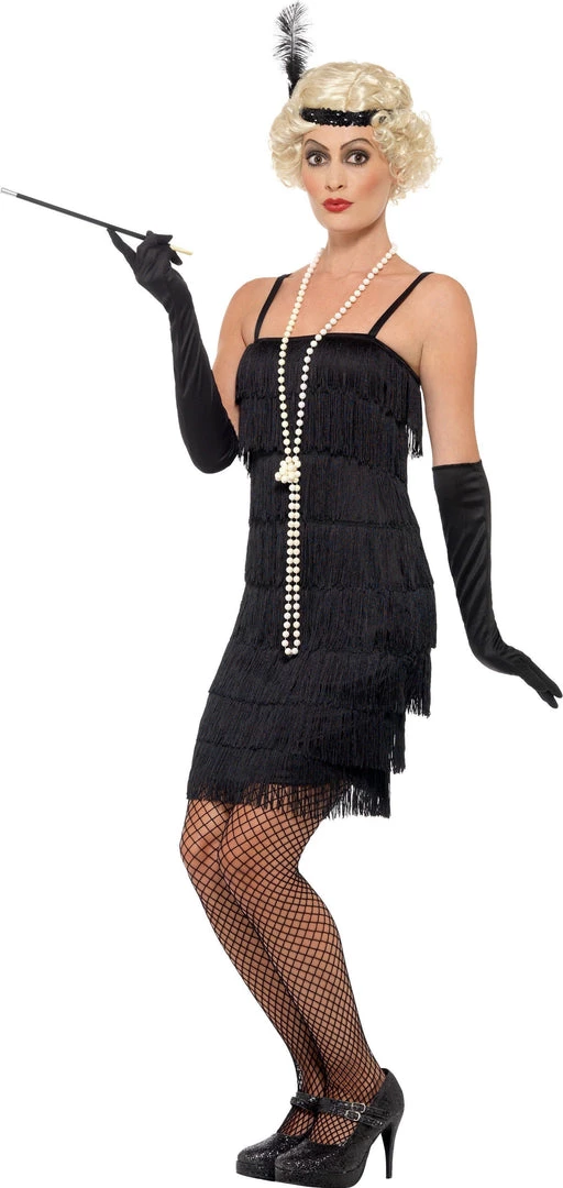 Classic 1920’s style fringed Flapper costume with slightly shorter hemline. This fun Gatsby inspired costume includes fringed black flapper dress, stretch sequin headband with feather and gloves. Wig, beads, feather boa, hosiery and all other accessories sold separately. Costume available in a range of sizes from S to XXL.Β