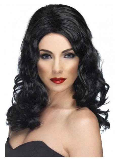 Long black wavy wig. Just the style for some 1940s burlesque glamour. Also perfect for Nigella Lawson, celebrity chef or the Kardashians or Eurovision superstar Conchita Wurst or a sultry witch at Halloween. Also available in blonde.