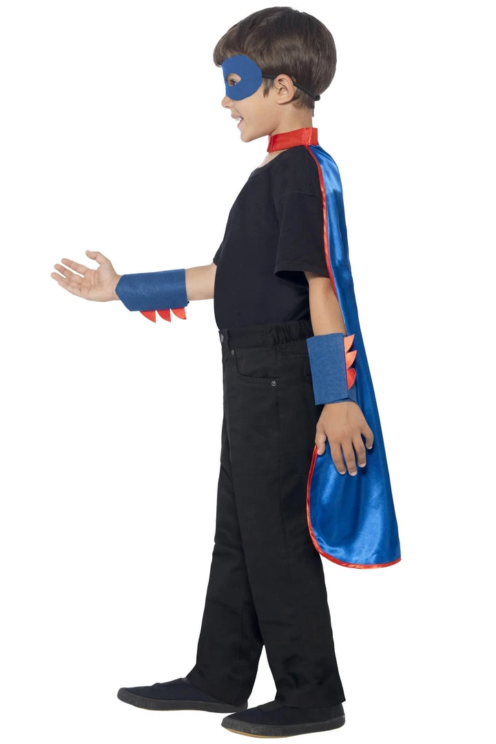 This is a super hero costume set for children.The kit includes blue cape with red trim with Boom! printed in comic print on the back, matching mask and wrist cuffs. Boom! all you need. Book Week costume shopping done and dusted. Perfect for girls and boys.