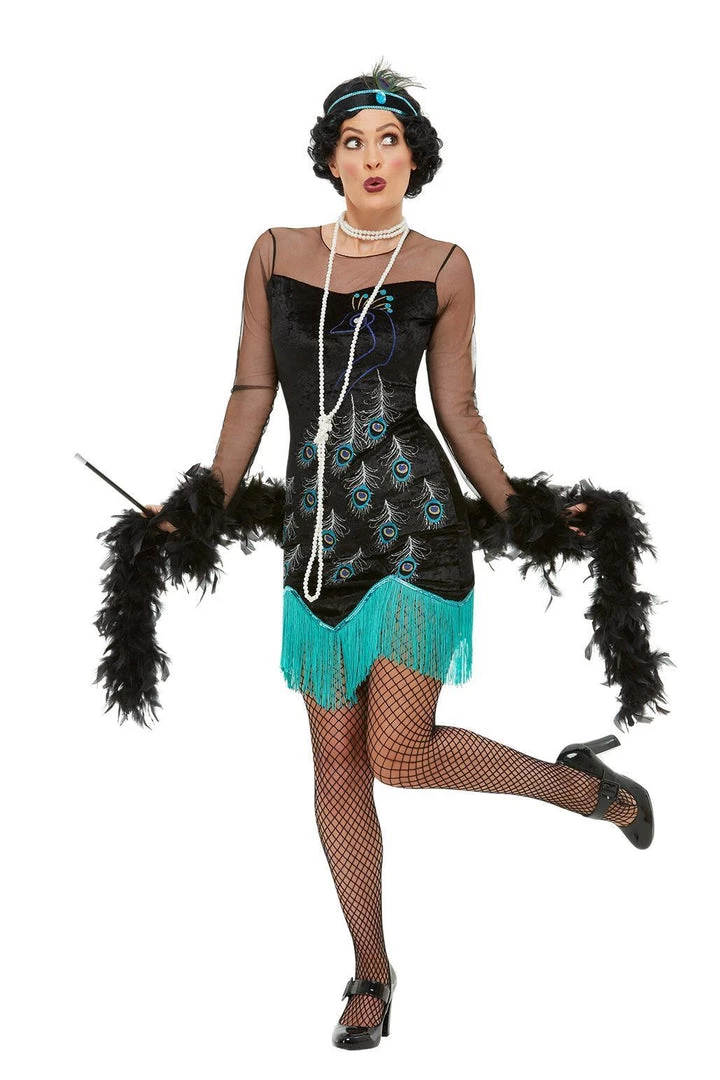Razzle dazzle in this stunning 1920s Gatsby inspired Peacock Flapper Costume. In this luxurious look 20s costume you would fit in perfectly at a legendary Jay Gatsby party or at a sparkling cocktail event on your cruise holiday. This costume includes dress in black stretch velour with printed shimmering peacock with glitter silver and turquoise feathers, hemmed with matching sequin trimmed turquoise fringing. Dress has sheer black yoke and sleeves to add that bit of sophistication and set it apart from most sleeveless flapper dresses. Comes with matching sequin trimmed headband with peacock feather. Dress and headband only. All other accessories sold separately.