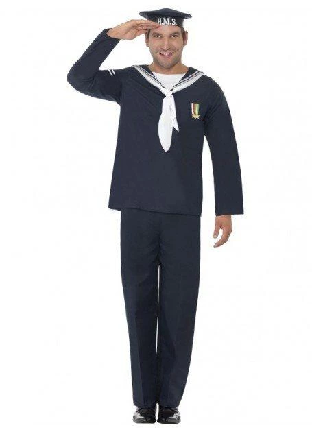 Classic sailor costume for men. Costume is vintage style uniform of navy blue shirt with attached scarf, matching trousers and hat.Â
