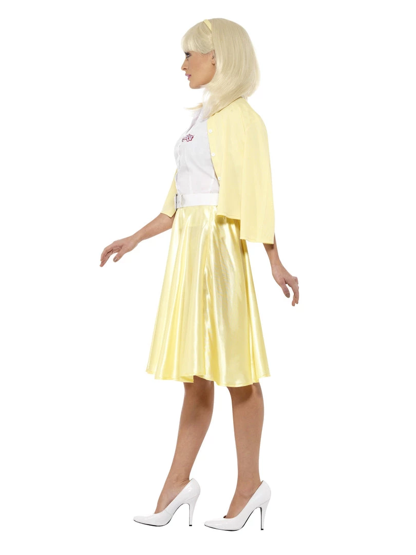 Dress up as Good Girl Sandy from Grease, just like the sweet Sandy Danny fell in love with. This licensed costume includes white top with Grease motif and attached pastel yellow mock cardigan, matching 1950’s rock and roll skirt which has stretch waistband, belt and yellow headband. Wig sold separately.