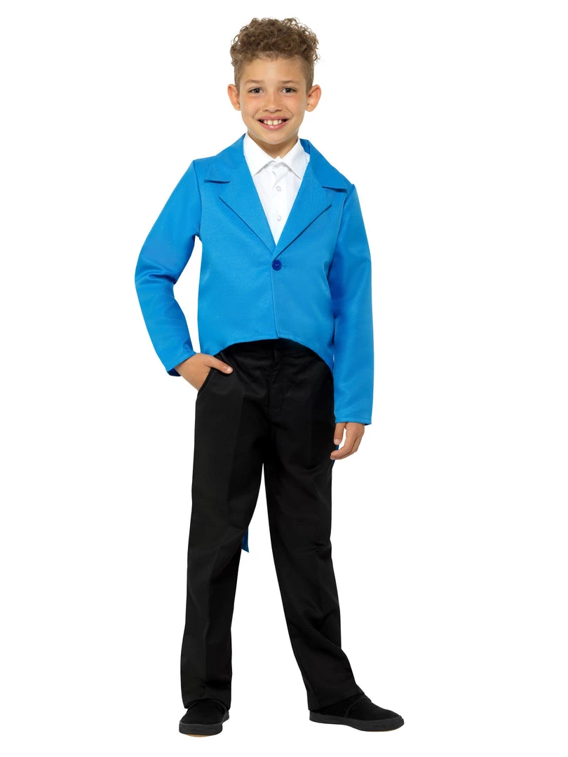 Blue tailcoat costume jacket for children. Wear over one of our bunny onesies as Peter Rabbit at Book Week, or be a magician, a circus showman or mc for the evening. Dress like a colonial gentleman for a school historical day. Packet contains one tails jacket. Shirt and pants not included. Suitable for girls or boys.Â