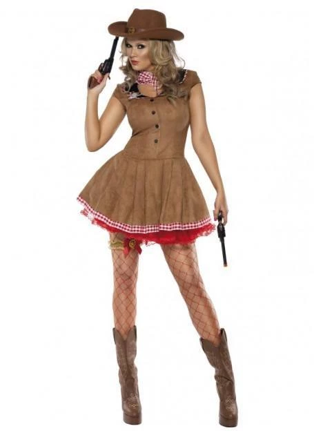 Howdy pardner. Y’all will have a rip roarin’ time in this fun and cute Wild West Cowgirl costume. Costume includes brown suede look dress with red gingham trim and sheriff badge. Hat, guns, petticoat, hosiery and all other accessories sold separately.