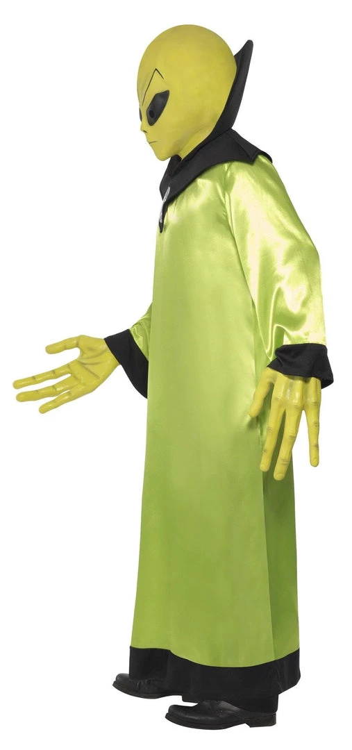 Alien Lord Adult Science Fiction Halloween Costume includes lime green gown with oversized black collar, green alien mask and matching large alien hands.Â