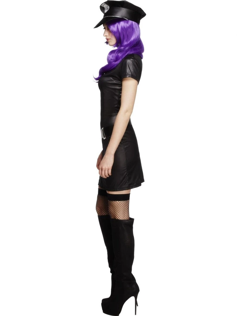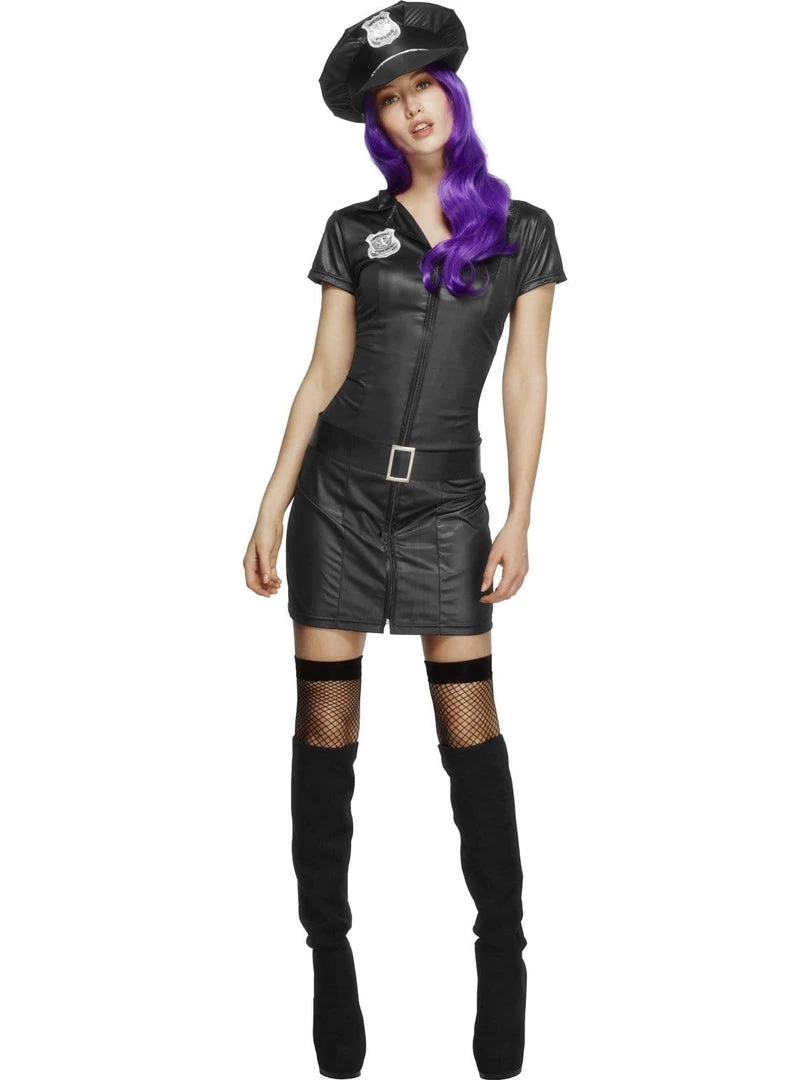 Have you been a bad boy? Do you need punishing? Hand out some punishment in this Sexy Cop Costume for women. Fever Corrupt Police costume is black stretch wet look dress that zips up the front and has police patch sewn on front. Comes with belt and matching hat.