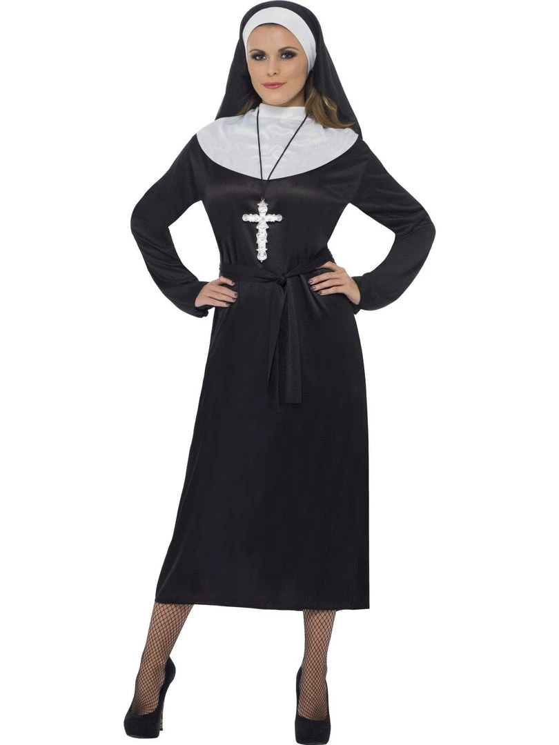 Classic nun costume includes long black dress with long sleeves, white collar and black and white headdress. Cross and hosiery sold separately. Nun costumes are a versatile costume to have in your dress up box. Perfect as creepy characters at Halloween, great for Buck’s Nights, Hen’s Nights and the classic Vicars and Tarts Parties just like in Bridget Jones’s Diary.