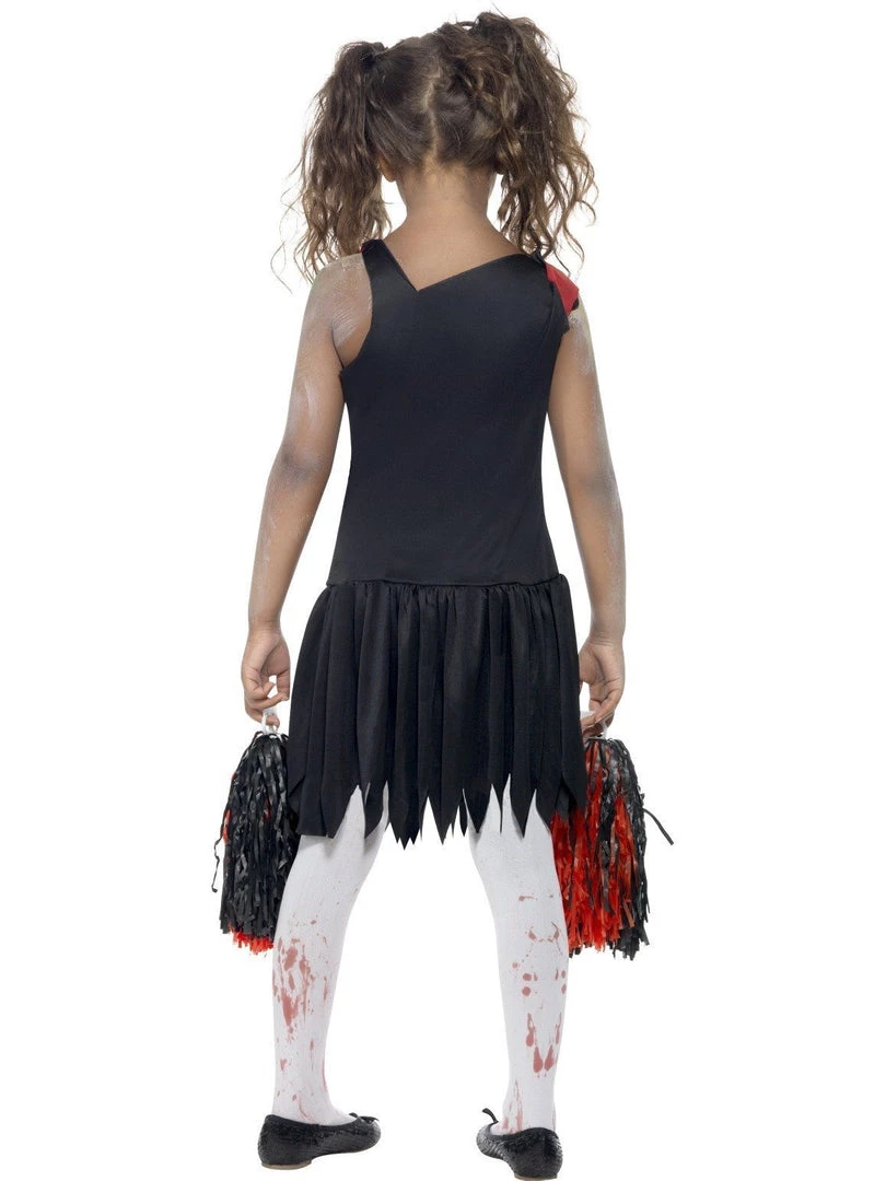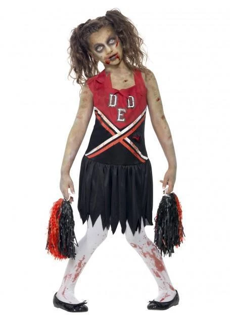 Zombie Cheerleader Halloween costume for children. Costume includes cheerleader dress with jagged hemline and fake blood stains plus matching pom poms. Make-up, hosiery and all other accessories sold separately.Â