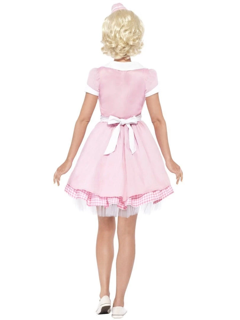 The pink women’s 1950’s diner girl costume includes a short pink and white dress with an attached white apron and a printed name badge on the bust. Completing this look is a matching mini pink hat.