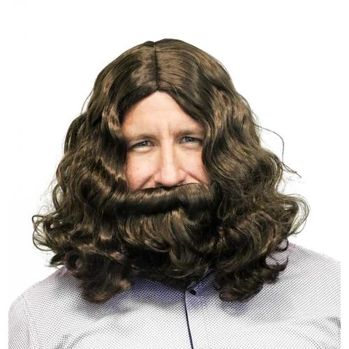 Jesus costume wig and beard set includes long soft wavy brown wig with middle part and matching beard. Suitable for Christmas and Easter celebrations.
