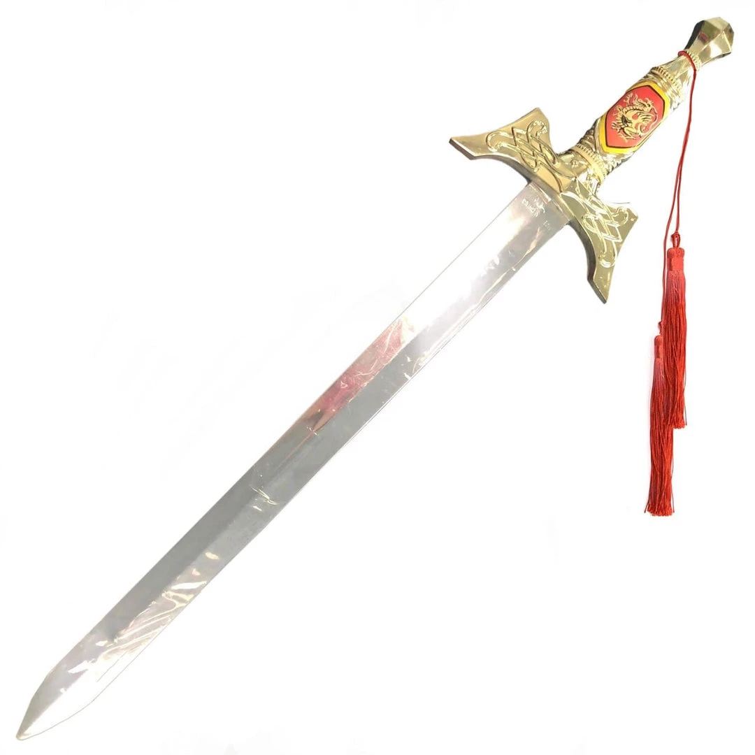 Gold handled plastic sword with a dragon design and a very shiny silver blade.