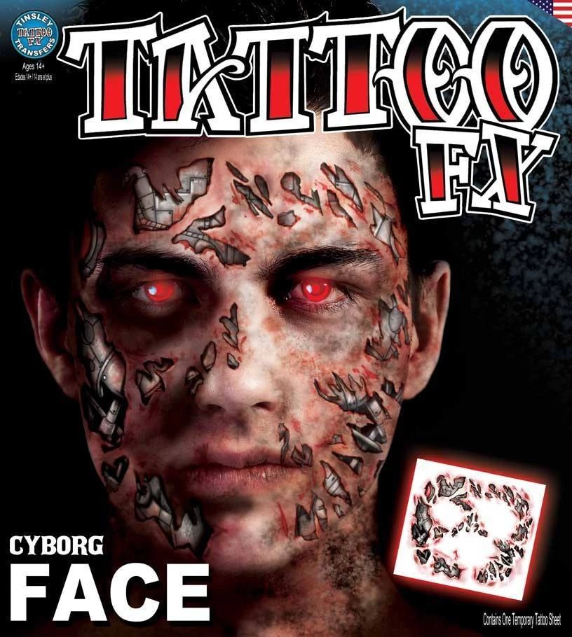 This Cyborg temporary tattoo was designed and sent from the future to destroy all previous robot costume models prior to the year 2015. It has been confirmed that this face tattoo will ramp up the BA levels of your next terminator reboot. Do not be affraid of the future…the future is only temporary