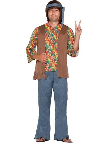 Cool man. Peace out in this retro 60’s Hippie Dude costume for men. Brightly patterned polyester shirt with attached fringed vest, stretch polyester denim look pants and matching headband. Complete your 1960s hippy costume with peace sign and wig. Dig it.