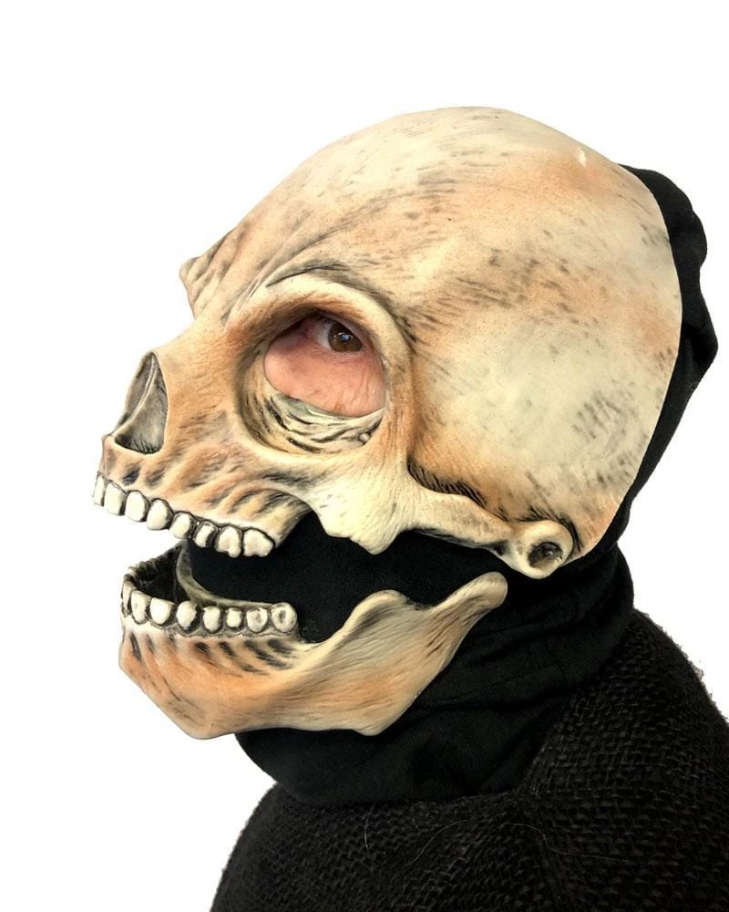Moving mouth sock mask of a traditional skull or grim reaper character. Bring the dead to life sculpt showing great detail and allowing for great movement. The sock mask design with the latex sitting on top of the sock allows the actor the capacity to make the mask move simply by making facial expressions. The sock acts a buffer for the actors skin to the latex adding to the comfort. Very comfortable to wear with excellent visibility. Perfect as a decoration for haunted mazes. Perfect for any Grim Reaper, Death or Skeleton Cosplay Character!